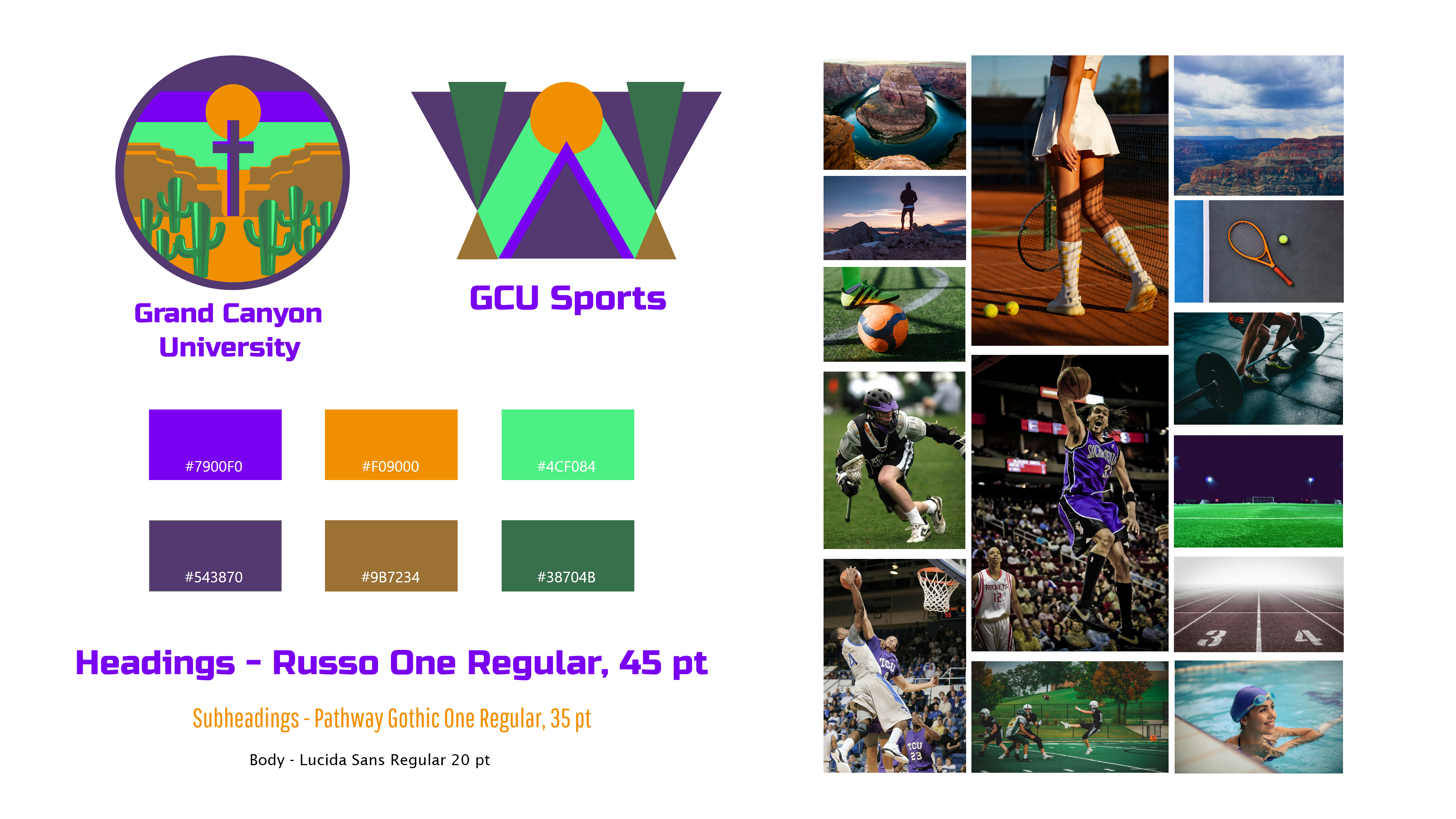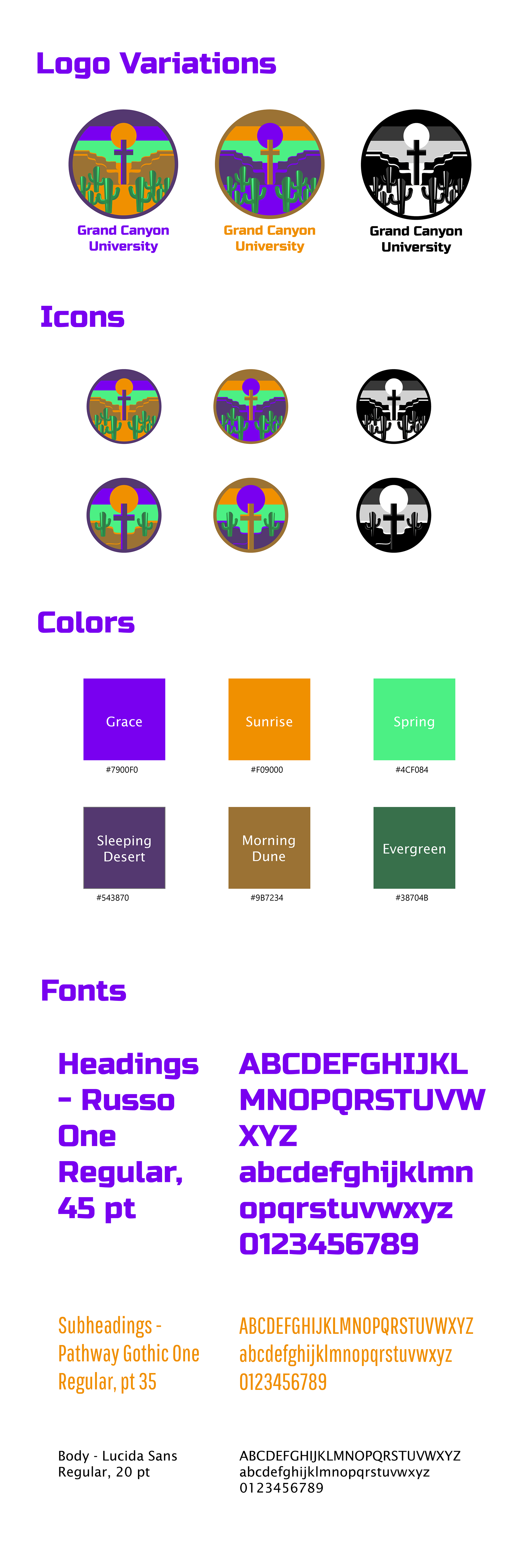 Once those were done, I created a mood board and brand guide featuring new imagery, colors, and typography for GCU.