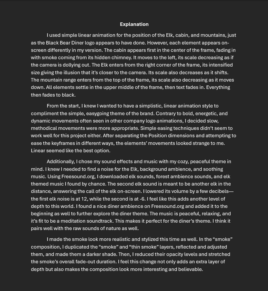 Using the preconceived assets for the logo, I ensured the Elk, cabin, and mountain range were on individual layers and imported the file into After Effects to prepare for animation. I animated the elements using position, scale, and opacity in addition to the Puppet tool for the Elk. Then, I added elk and forest ambience sounds and music. Furthermore, I was tasked with writing an introduction to the brand as well as an explanation